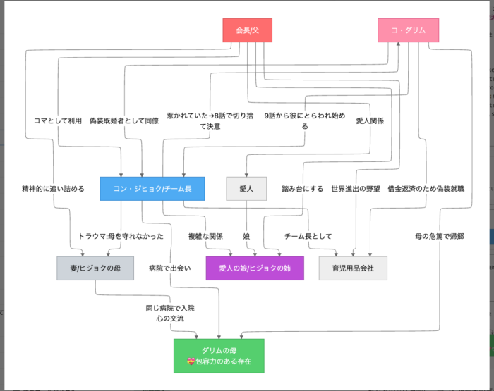さきほどの韓国ドラマでは、登場人物の影に抱えている問題点が複雑だったため、Notionのコードブロックを用いて、Mermaidで作図させていました。