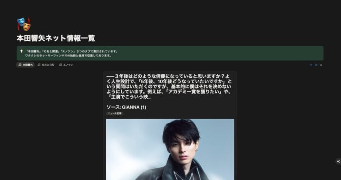 去年の夏ごろから、推しの情報を収集するため、ネット記事や公式Instagramの投稿を一目で確認できるようにするため、Notionを利用しました。